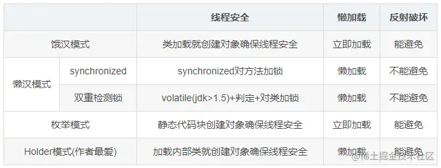 在调用getInstance方法的时候,Holder类才会被加载(这里可以去看下类加载的时机),到了初始化阶段会对静态变量instance赋值,属于()过程,而该过程是保证线程安全的,静态内部类在用到时候才会加载,因此该模式属于延迟加载,与饿汉模式类似,私有构造方法进行判定避免了反射破坏。