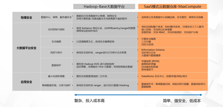 MaxCompute作为云原生、全托管的企业级数据仓库服务,构建在阿里云大规模计算、存储资源之上,以Serverless架构提供全托管的在线数据仓库服务。从底层基础设施、数据中心、网络、供电等,到中间的平台能力安全,再到向上的用户权限管理、隐私保护等提供三级超过20项安全功能,兼具开源大数据与托管数据库的安全能力,为云上企业提供持续的SaaS化云上数据保护。
