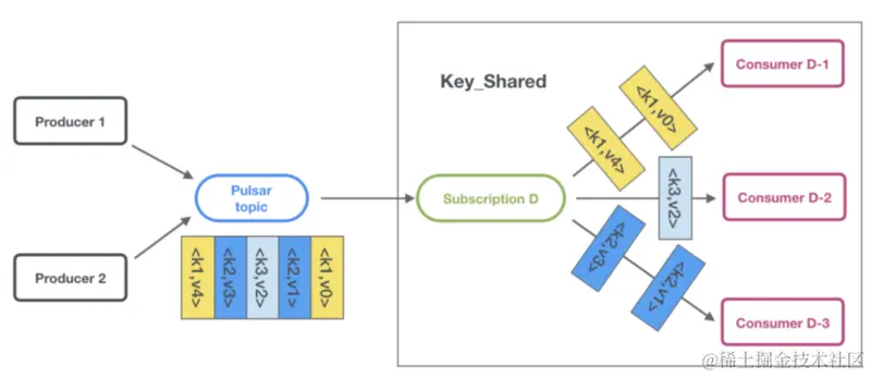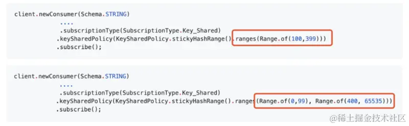 Key_Shared 订阅模式可以保证用户在订阅到某个 topic 时,可以指定 producer message key。消息会根据指定 key 的不同,通过 hash range 有序发送到不同的 consumer。