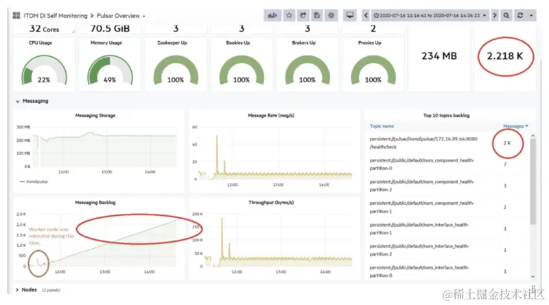 根据上图左边圈出来的部分可以看出,message backlog 一直处于增加的状态。Backlog 就是在消息生产—消费过程中,没有被 consumer 消费掉的消息堆积,正常情况下,producer 生产消息与 consumer 消费消息的速率大致是一样的。但是从上图中的递增状态的 backlog 就表明了,消息生产消费过程中出现了消费不均衡状态。