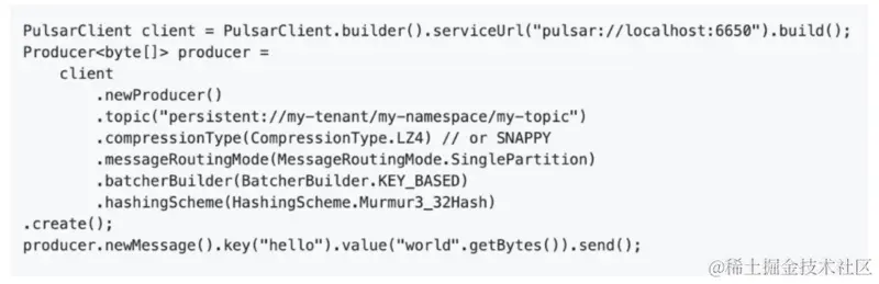 一般为了节约网络带宽,在创建 producer 时,会根据不同场景选择不同的压缩类型。Consumer 端使用了 Key_Shared 订阅模型来订阅 topic,在消息中,标注消息的重要字段可能是 payload 字段。