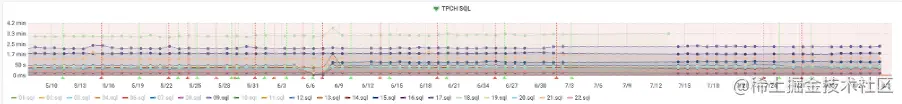 为了测量优化器和执行器,从去年开始我们构建了daily benchmark 平台 perf.pingcap.com,覆盖常见的几种复杂查询的测试场景,包含 TPC-H、TPC-DS、Star Schema Benchmark 等,跟踪每天开发分支上这些查询的执行速度情况。