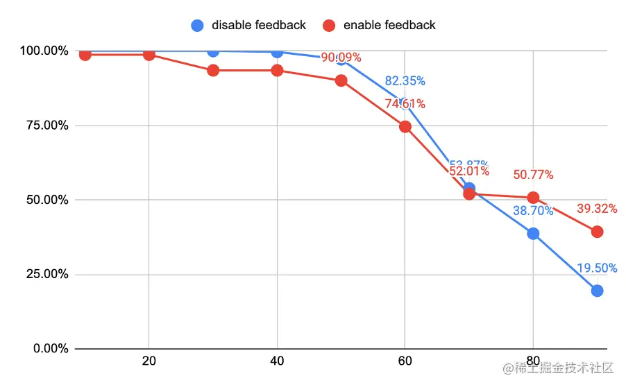 曲线上的点表示有效性指标大于横坐标数值的查询的比例。从数据上看,当打开 feedback 时,有 50.77% 查询的有效性指标超过了 80%,即对于一半以上的查询优化器选择到了较优的执行计划。而当关闭 feedback 时,这个比例只有 38.70%。这和我们通常所认为的 feedback 能够一定程度抵抗统计信息过期相符。