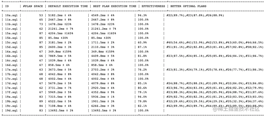ID 列标识查询的名称,#PLAN SPACE 是这条查询当前 TiDB 的搜索空间,DEFAULT EXECUTION TIME 记录了默认执行计划的执行时间(通过中值以及上下界偏差比例给出),BEST PLAN EXECUTION TIME 给出最优的执行计划的执行时间,EFFECTIVENESS 算出该条查询优化器的有效性,BETTER OPTIMAL PLANS 给出更优的执行计划的 ID 以及对应执行时间和默认执行计划执行时间的占比。