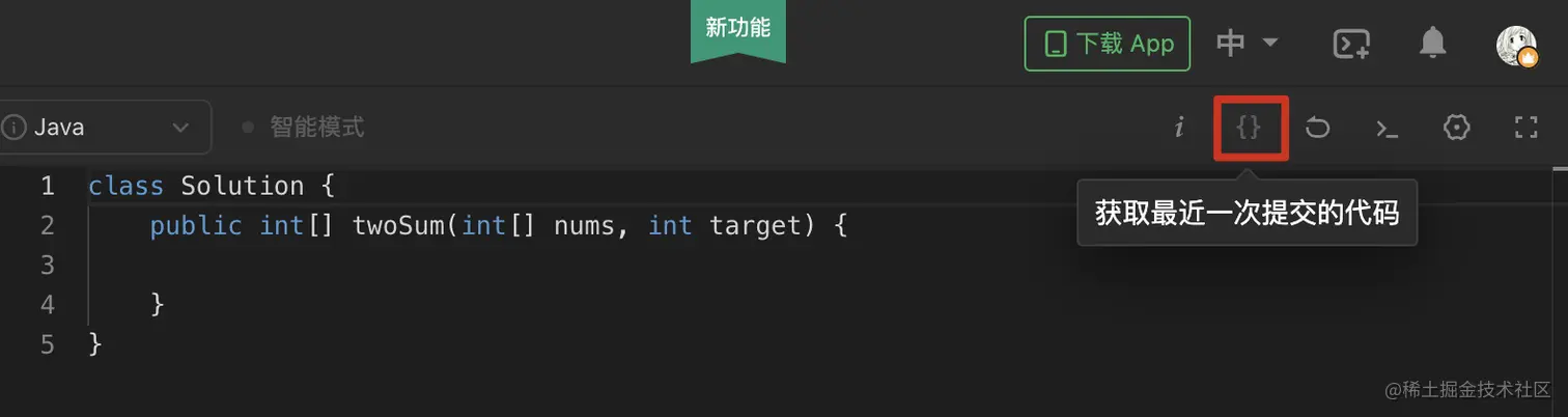 以第一题为例,点击代码编辑区域上访的 {},获取最近一次提交的代码。