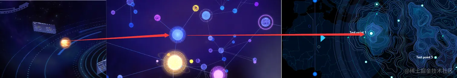 3.点选主题一中的行星跳转到的主题二的拓扑结构,点选主题二的星体跳转主题三的地形,主题三无法向前关联,只能通过前两种方式进行跳转: