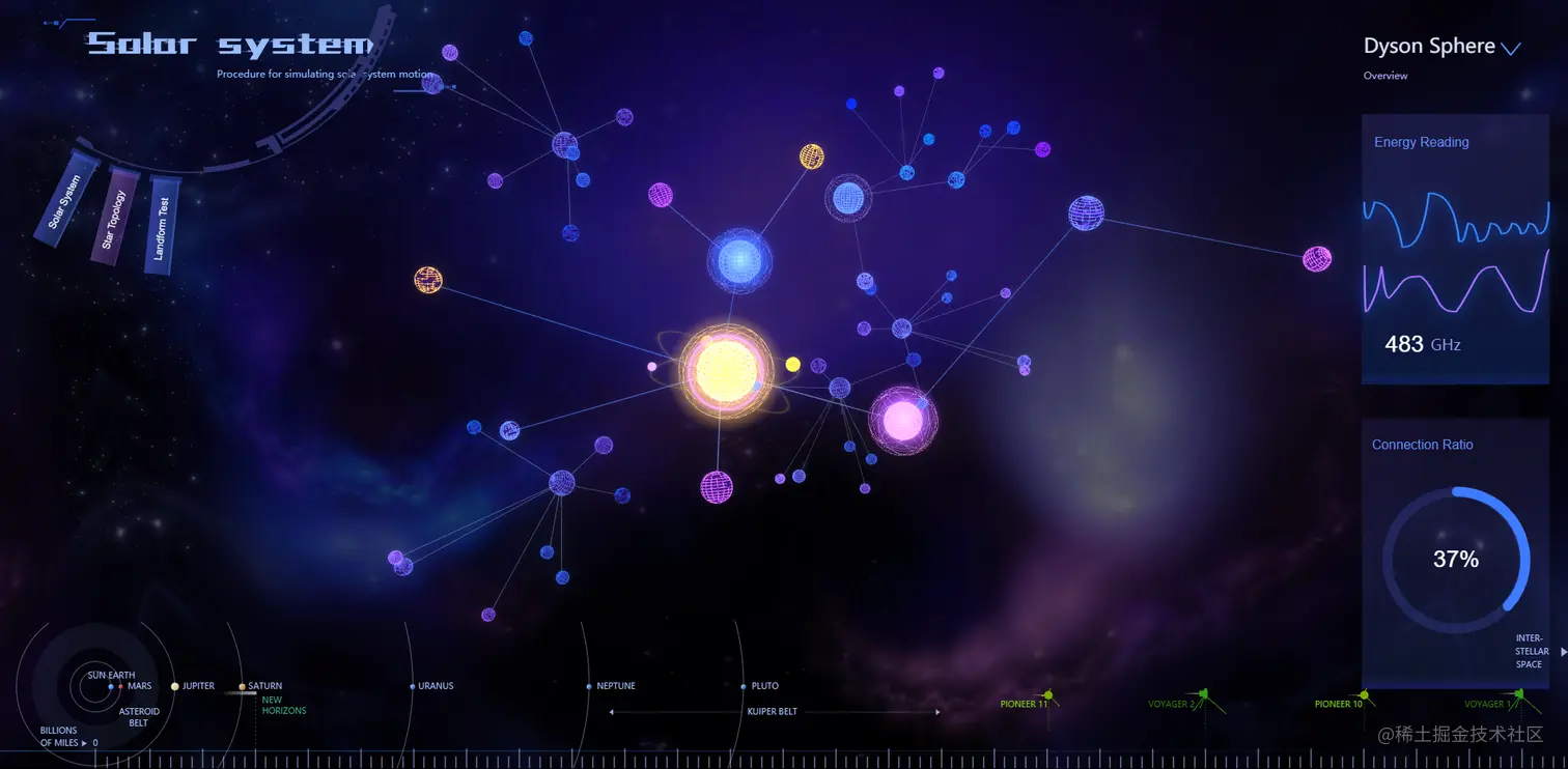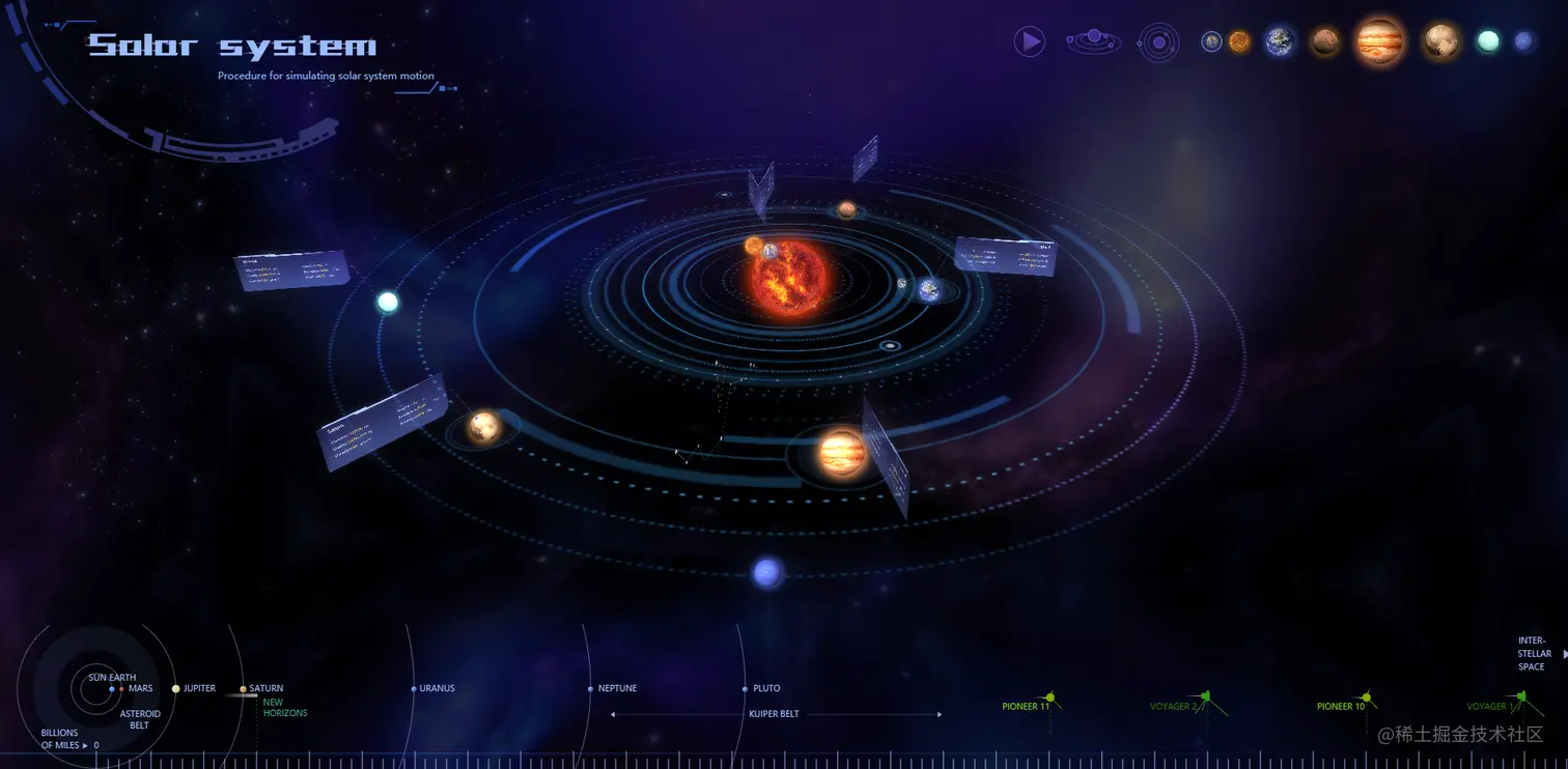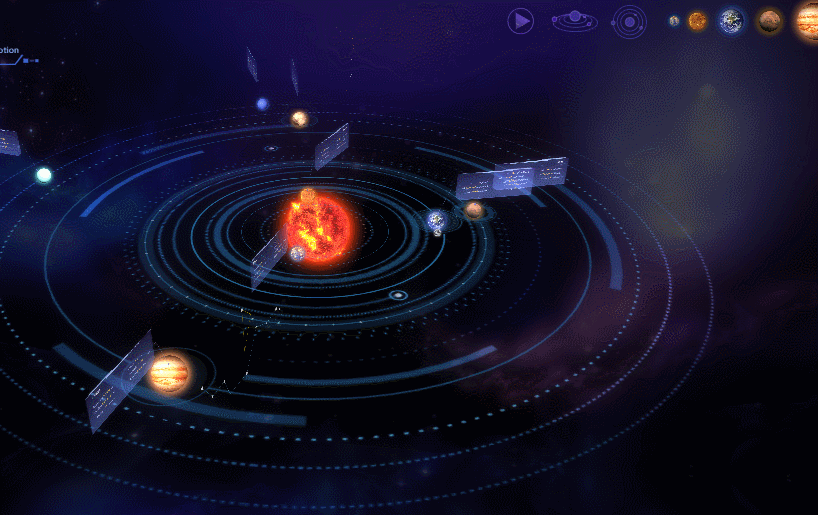 1.作为科研成果、新发现的载体,做 3D 太空数据可视化呈现,用于向普通民众科普太阳系的构成、各行星组织结构等知识,可置于博物馆大屏、学校大屏,也可用于互联网产品,作为航空航天类网站的门户页、展示页。