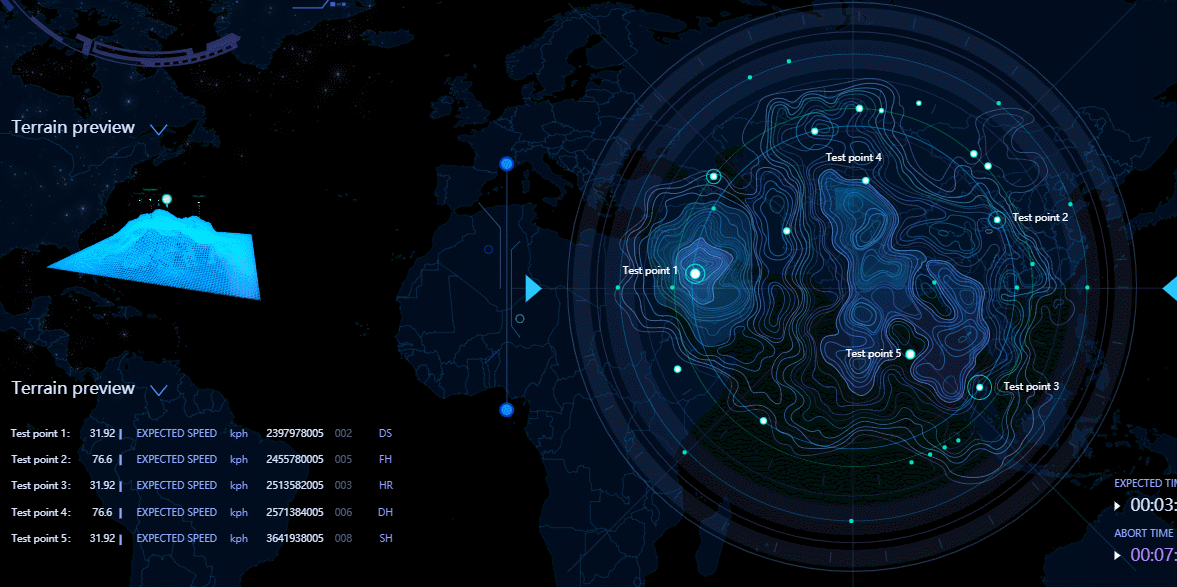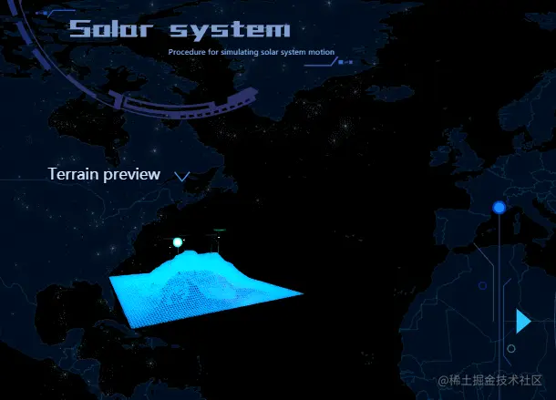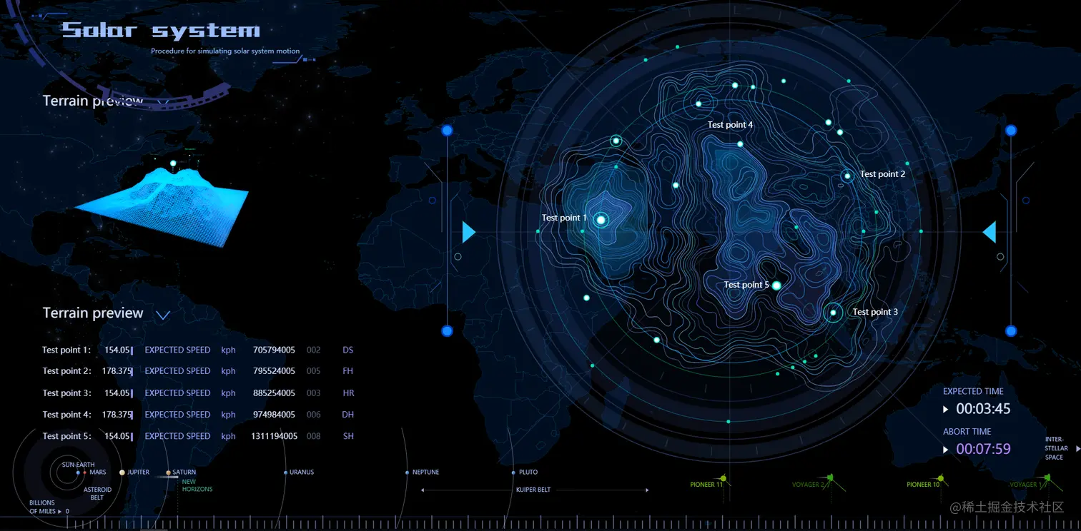 该主题主要用于呈现在场景二中点选的星体上具体的检测点位,点位周边的等高线在左侧自动生成一个 3D 的地形和闪烁的点位示意,并与右侧的检测点位一一对应。