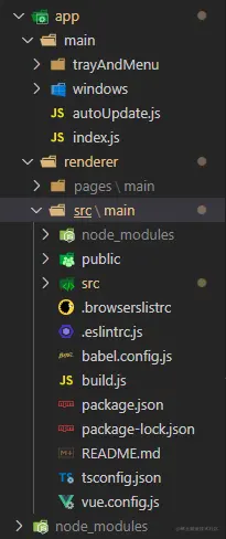 其实说是说渲染进程,我们为了方便理解,其实你就可以把它想象成一个加强版的Web页面,所以我们可以驾轻就熟的找到这个项目的Vue相关代码(具体路径:app/renderer/src/main)。