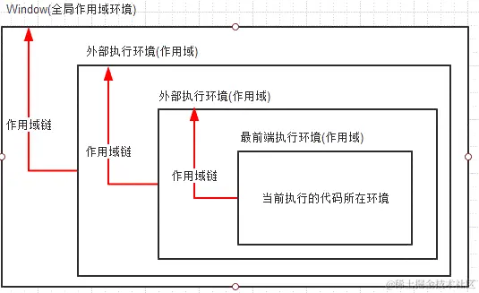作用域链的前端,始终都是当前执行的代码所在环境的变量对象。如果这个环境是函数,则将其活动对象作为变量对象。活动对象在最开始的时候只包含一个变量,即arguments对象(这个对象在全局环境中是不存在的)。作用域链中的下一个变量对象来自包含(外部)环境,而再下一个变量对象则来自下一个包含环境。这样,一直延续到全局执行环境;全局执行环境的变量对象始终都是作用域链中的最后一个对象。
