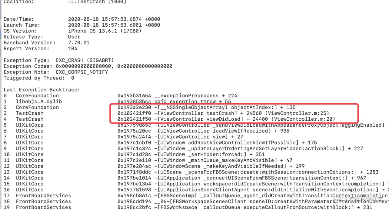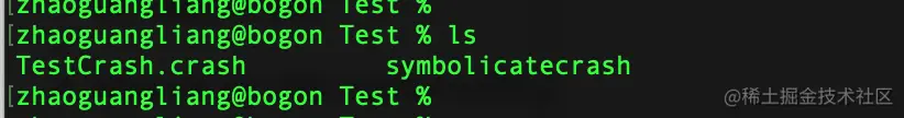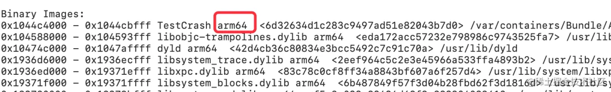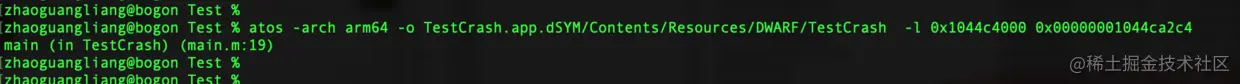 cd到dSYM文件所在的文件夹,执行 atos -arch arm64 -o TestCrash.app.dSYM/Contents/Resources/DWARF/TestCrash -l 0x1044c4000 0x00000001044ca2c4