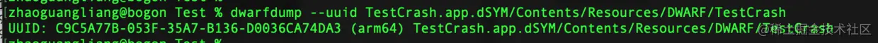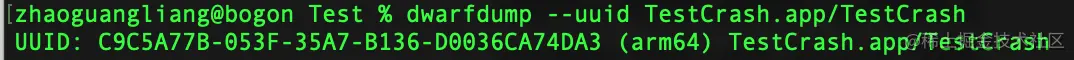 使用示例如下: dwarfdump --uuid TestCrash.app.dSYM/Contents/Resources/DWARF/TestCrash
