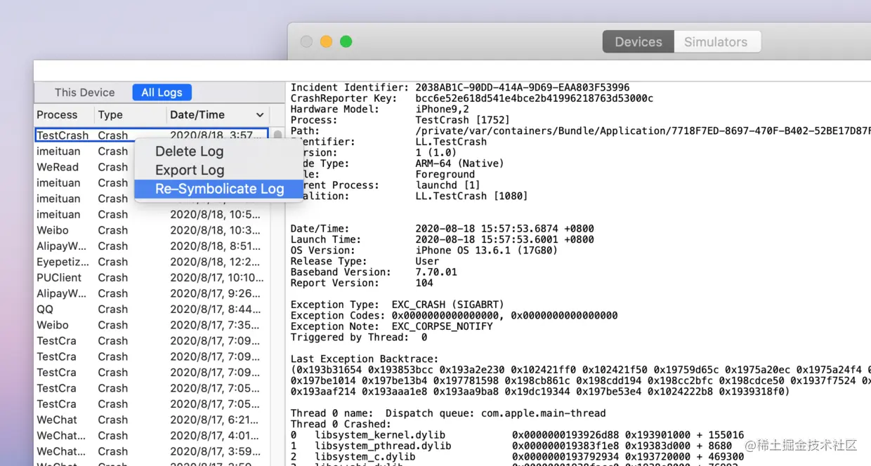 复制苹果给的报错报告,可以直接在网页右键,保存为.carsh格式,然后直接拖动到手机端端deviceLog列表,进行符号化的操作,就可以看到部分内容被符号化,然后搜寻关键的信息排查问题。