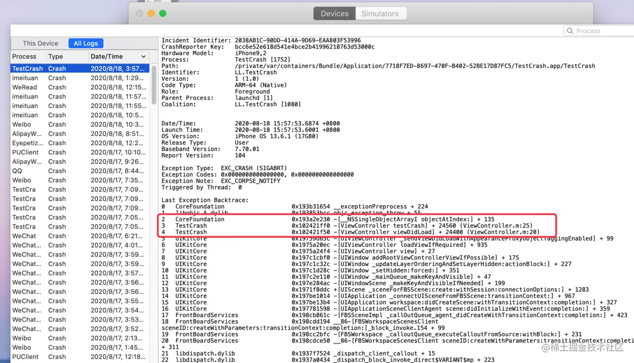 可以看到报错的方法名及崩溃原因: