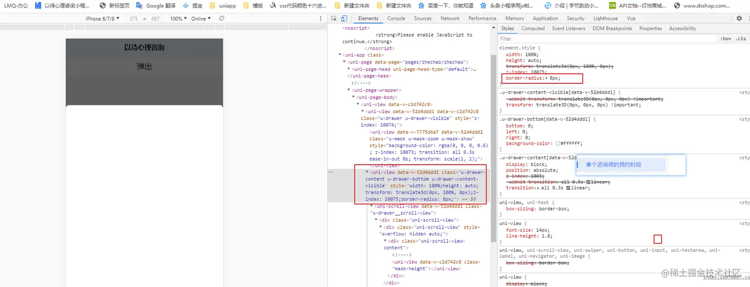 弹出层bug (不是) 草莓千层蛋糕 2020-08-20 97 阅读1分钟 父盒子和子盒子都得加 border-radius // 选择支付方法 .mask-height{ width: 100%; height: 1017rpx; background-color: #FFFFFF; border-radius:17rpx 17rpx 0rpx 0rpx ; } /deep/.u-drawer-visible uni-view:nth-child(2){ border-radius:17rpx 17rpx 0rpx 0rpx ; } 其实是没有选对