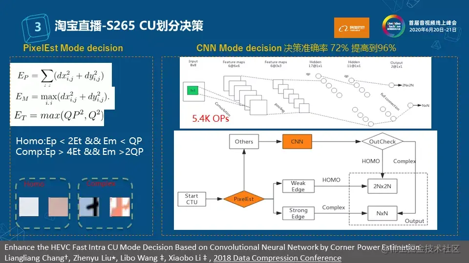 第一步可以解决大部分块划分的决策问题,但是对于模棱两可的块,则需要依靠CNN模型来辅助划分。我们使用了一个5层网络的小模型把决策的准确度从72%提升到了96%;这个成果我们跟清华大学刘老师合作发表了一篇论文,在DCC会议上展示。