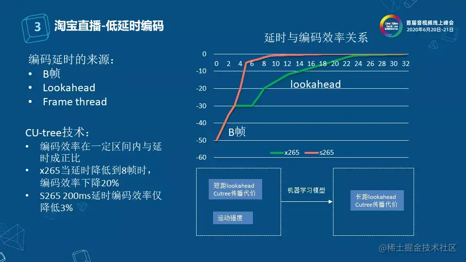 这是我们在低延时编码上做的工作。编码延时主要来源三个方面:B帧、Lookahead以及Frame thread。以x265为例,编码效率在一定区间内与延时成正比。当延时降低到8帧时,编码效率下降20%,5帧的编码效率下降30%;优化后S265采用了短距Lookahead CU-tree传播代价以及运动强度,作为机器学习模型的训练数据,预测长距lookahead CU-tree传播代价来提高我们在低Lookahead下的编码质量。如图,S265在5个延时帧下,可达到95%以上的编码效率。