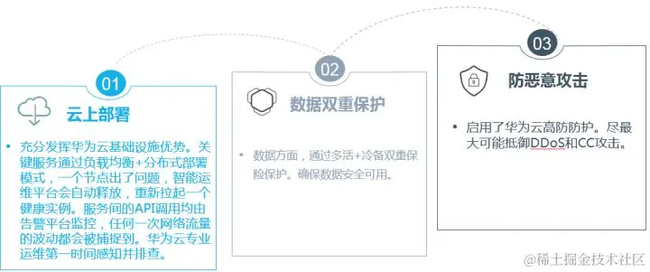 数据方面,通过多活+冷备双重保险保护,确保数据安全可用。同时,启用华为云高防防护,尽最大可能抵御DDoS和CC攻击。