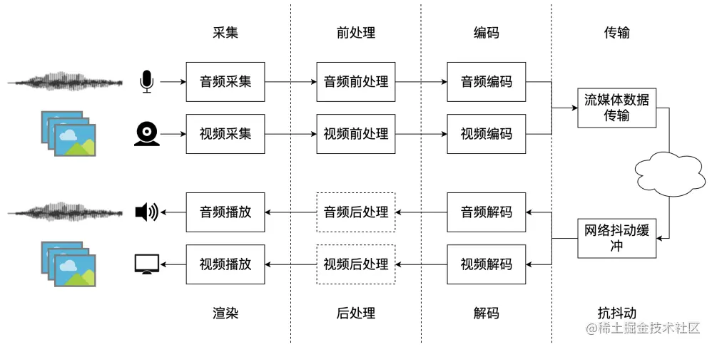 第二个是前处理。比如实时音频的回声消除、噪声抑制、自动增益3A处理;语聊场景的变声;实时视频的美颜、挂件、磨皮、瘦脸等。这些都会产生时延,我们可以从两个角度来看时延的产生: