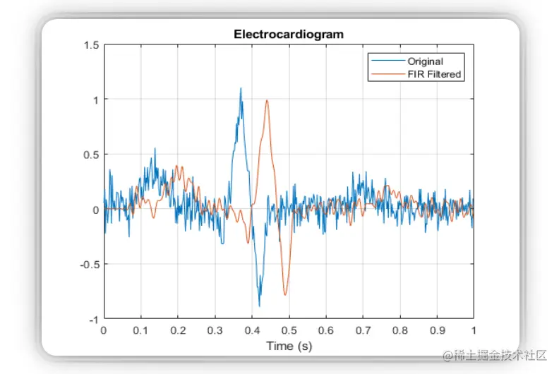 第一个是算法的固有时延,在下面的图片中,原始数据是蓝色的曲线,我们想通过FIR低通滤波给它做平滑处理,可以看到这个效果是不错的,它确实变平滑了而且它的波形没有太大变化,但是我们也可以看到它整体向右移了,这其实就是算法的固有时延。