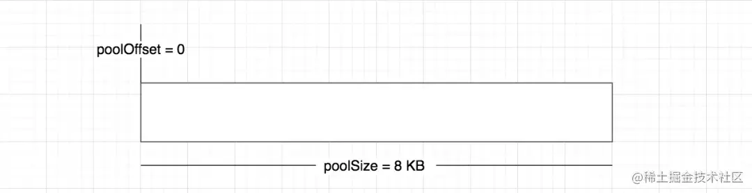 以下代码的示例:在加载时使用了createPool()方法相当于初始化了一个8KB的内存空间,这样在第一次进行内存分配时也会变得高效,初始化时还创建了另一个对象poolOffset ,这个变量会记录已经使用了多少内存空间。Buffer.poolSize = 8 * 1024 var poolSize,poolOffset,allocPool ....... 中间代码省略 function createPool(){ poolSize = Buffer.poolSize; allocPool = createUnsafeArrayBuffer(poolSize) poolOffset = 0; } createPool() // //此时,新构造的flab如下图所示
