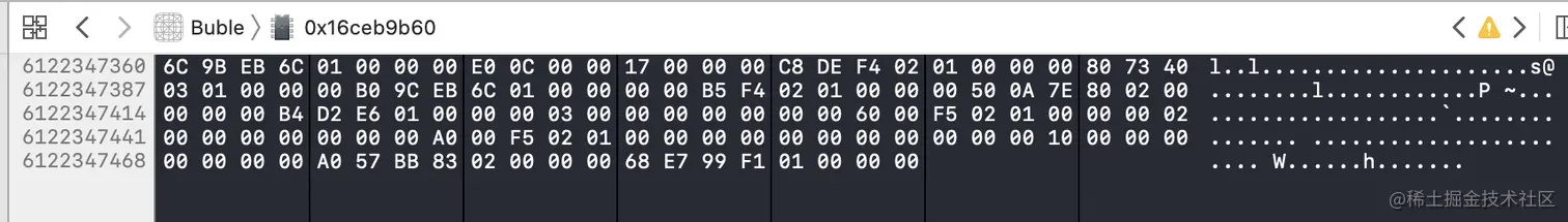 ③ 由于此块数据块被声明为一个指针变量,意思就是系统需要根据这块的数据去当做地址继续“索骥”,也就是去找地址位为0x000000016ceb9b6c 的数据块继续解析数据