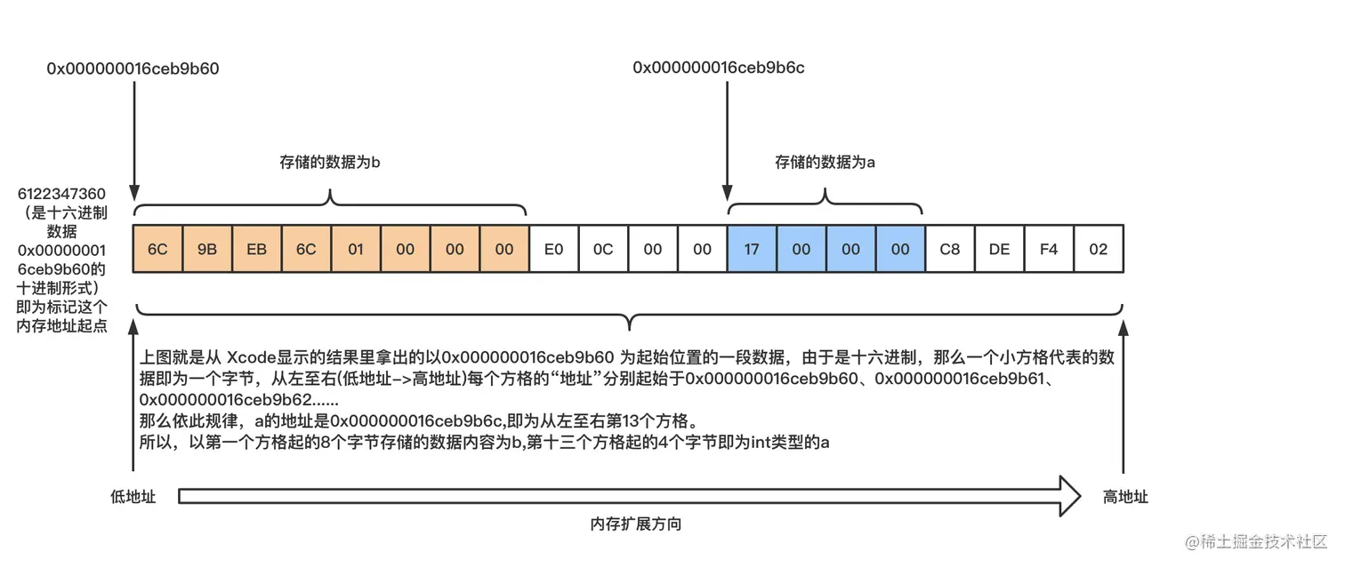 知道了a 的地址是 0x000000016ceb9b6c,又知道这块内存存储的数据要被解析成int类型,那就从 0x000000016ceb9b6c 开始“顺藤摸瓜” 找到连续的4个字节的二进制数据,也就是上图所示的十六进制形式的从内存低地址位到高低地址位的17 00 00 00,换算成二进制结果是多少呢?