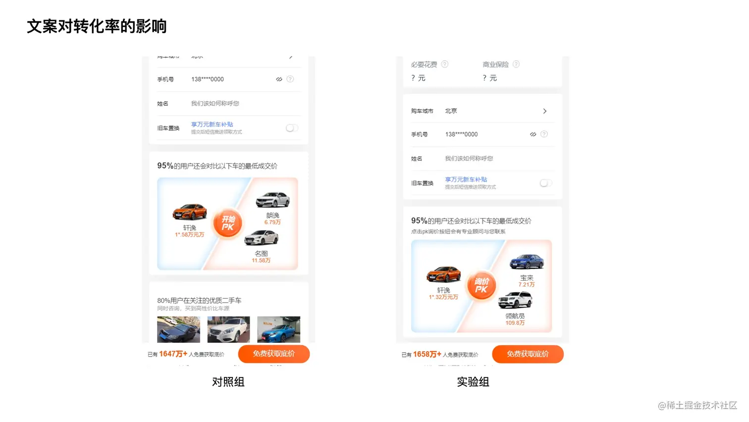 推荐车系部分按钮文案的改变,对转化率有非常大的影响,使用“开始pk”转化率明显高于“询价PK”。