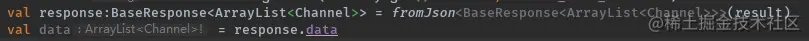 val response:BaseResponse<ArrayList<Channel>> = fromJson<BaseResponse<ArrayList<Channel>>>(result)