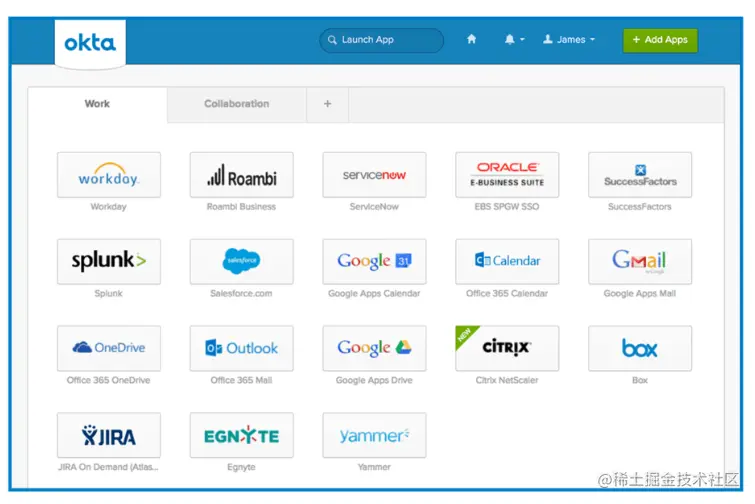 从 Okta 平台单点登录到各应用中(来源:Okta 官网截图)