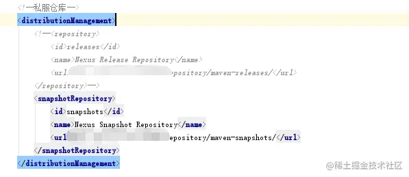 首先在你的pom文件里配置私服地址,如上图,snapshots和上面的Maven配置文件里的id要一致,否则上传的时候会出现权限异常,不允许上传。