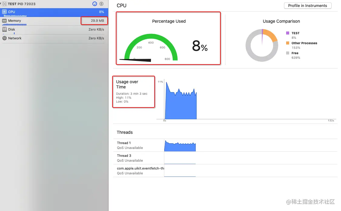 YYkit 加载gif 的过程中,memory 基本不会过度使用,但是最初会有一段时间CPU的使用率会很高达到 98 %,