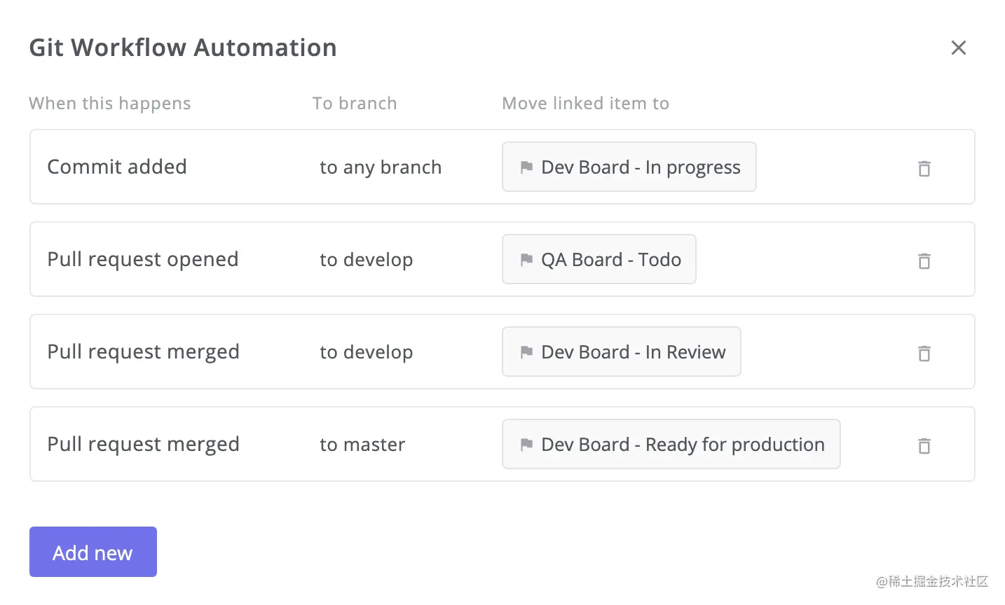 因为 Zepel 与 GitHub,Bitbucket 和 GitLab 进行了深度集成,我们在内部使用 GitHub。因此,一旦我们将 GitHub 与 Zepel 集成在一起,我们的开发团队就会在 Zepel 中设置 git 流程自动化。以下是现在的样子: