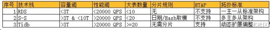 下面这个表里显示的,我们主要就是三类技术站,按照容量阀、性能阀、大表的数量、分区规则、 HTAP,以及拓扑结构这几个纬度进行筛选。