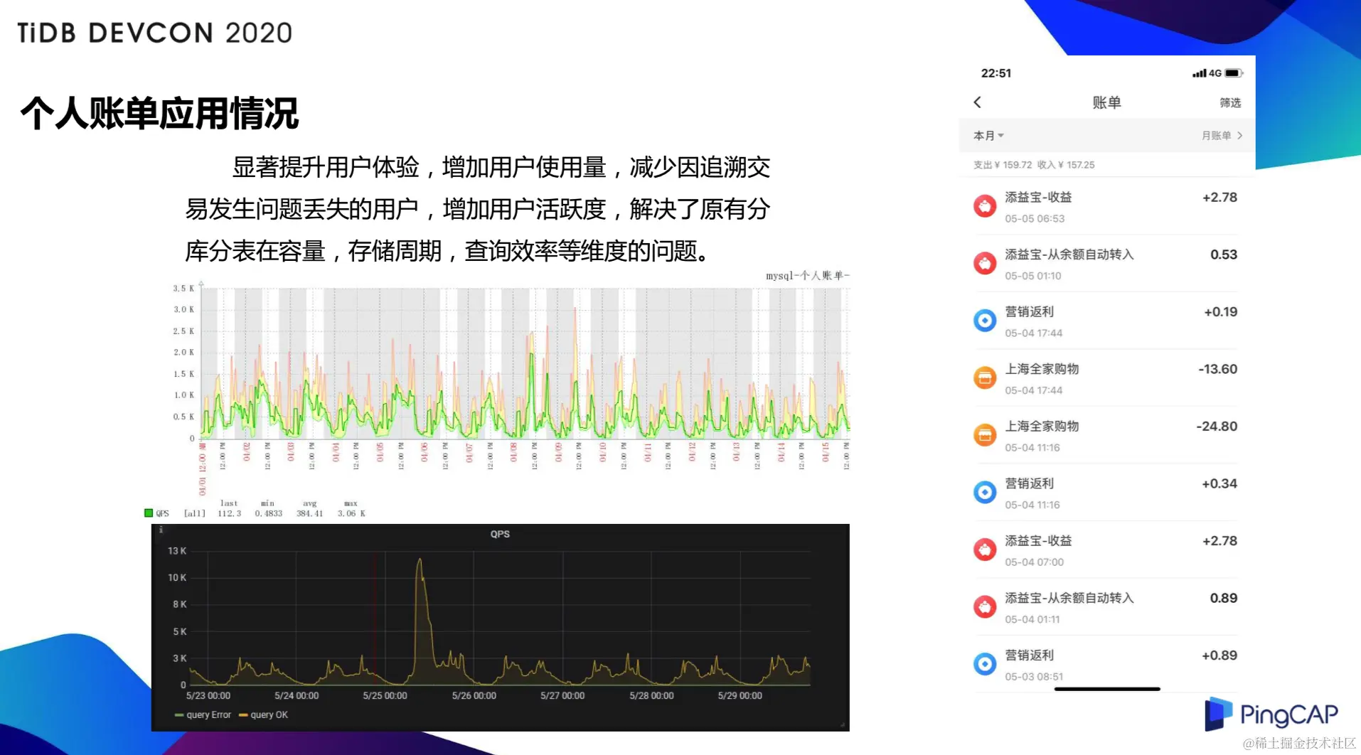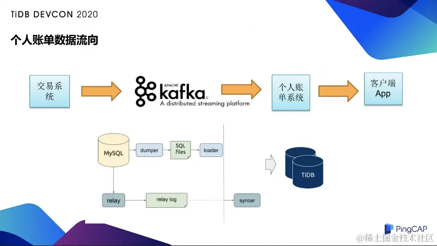 这里是个人账单的数据流向图。首先是交易系统会把交易的信息同步到 kafka 里,然后会消费到个人账单系统里面,经过个人账单系统的处理展示到 APP 端。这里我们选用了 TiDB 的 DM 进行了 MySQL 迁移到 TiDB, DM 工具既可以支持全量备份文件,将 MySQL 的数据导入 TiDB,也支持通过解析执行 MySQL binlog 的方式来增量同步到 TiDB,同时它也满足了我们多个 MyCat 的分库分表,需要合并到同一个 TiDB 一张表的场景。DM 提供了比较好的支持,大家可以看一下 DM 的工作原理图,上面就是数据的全量迁移的功能,下面的数据流就属于一个增量数据同步的过程。