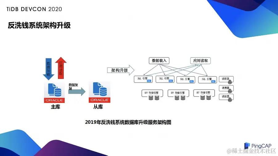 我们按照 TiDB 的形式进行架构升级,从原来的 Oracle 同步到 TiDB 使用的是(OGG for MySQL client ) 来完成的。还有一部分数据是在大数据平台,我们使用大数据的发布功能,从 Hive 直接去同步到 TiDB。
