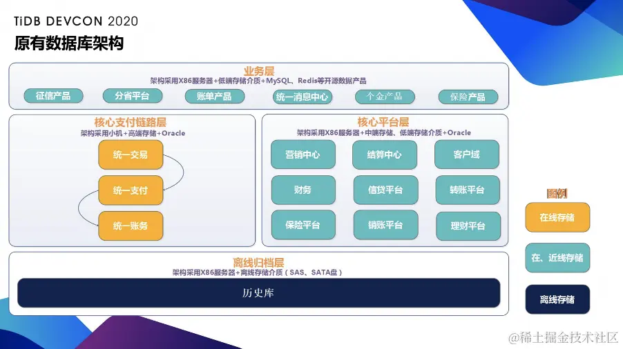 第三层是核心平台层,指的是辅助核心支付链路完成整个交易流程的平台,或者是自己具备一些自身能力的平台,该层在保证性能及稳定性的同时会减少高端存储的使用成本。