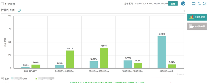 在某客户采用阿里云DCDN上传之后,上传的效率可以提升超过50%,同时,DCDN支持最大2G文件的上传。如下图所示,某客户经过DCDN加速以及没有经过DCDN加速上传文件的上传速率的对比情况。图中蓝色部分上传速率有超过60%的提升,可以达到1500kb/s以上,而绿色的未经过DCDN加速的上传速率落在300~500以及500~1000kb的区间内。所以,DCDN对上传速率及用户体验提升效果十分明显。