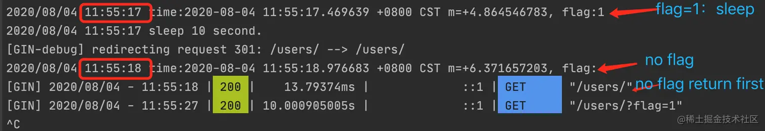 11点55分18秒 发送了一个不带 flag 参数的请求,表示不 sleep,只打印一条数据。