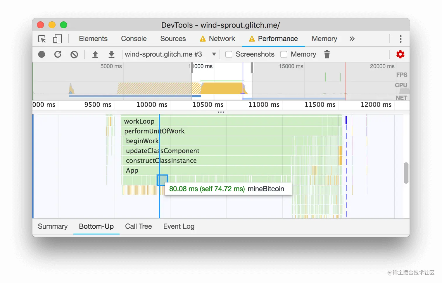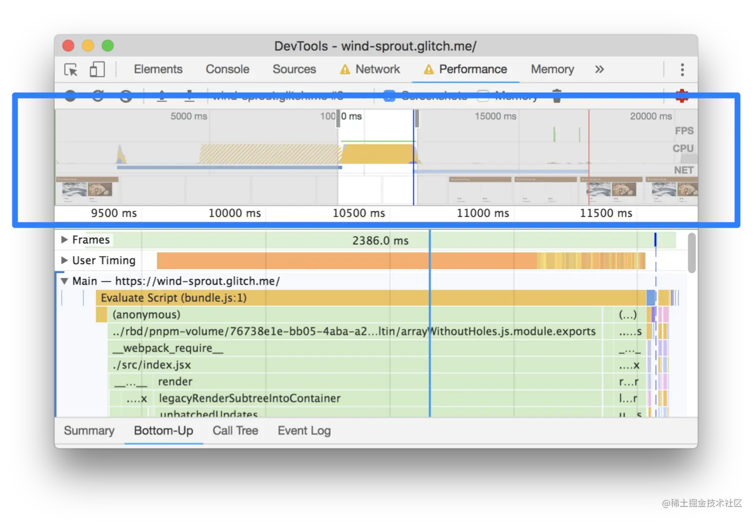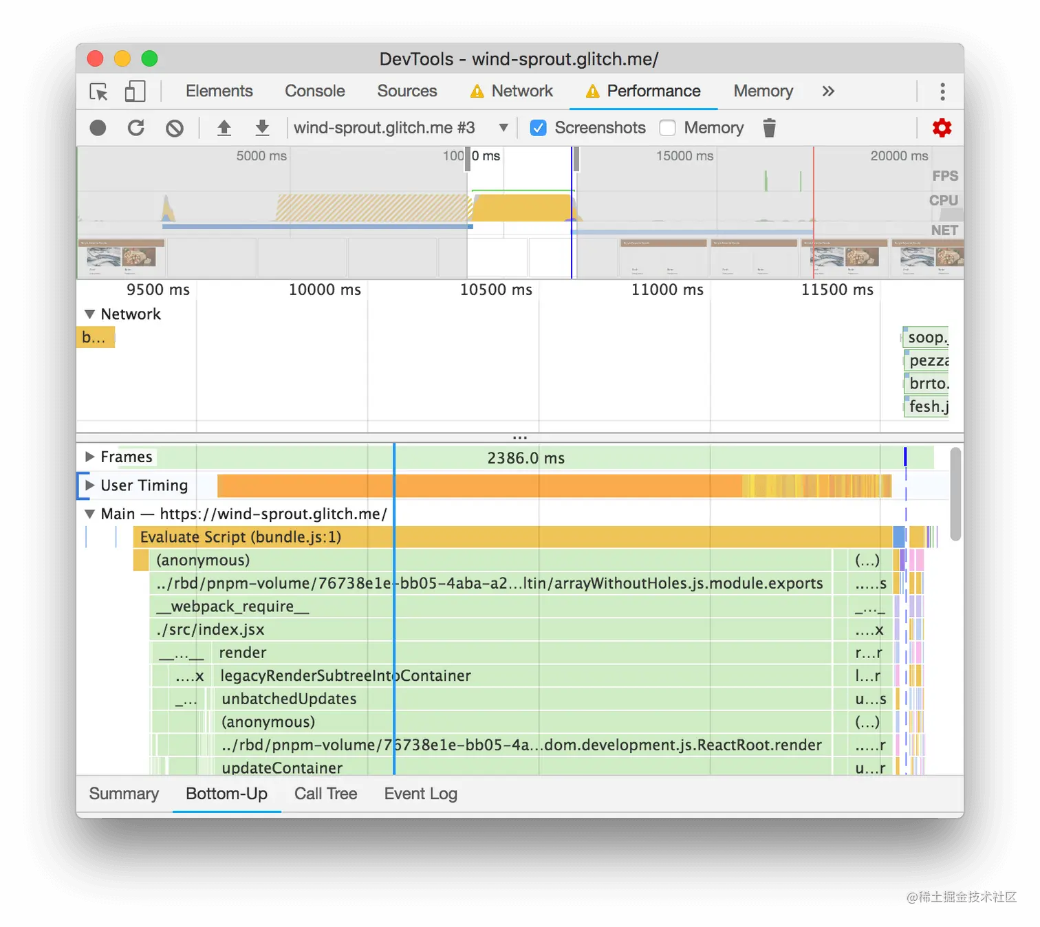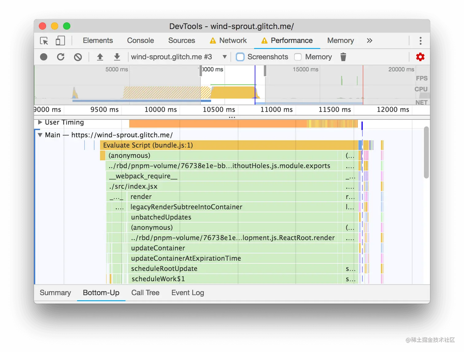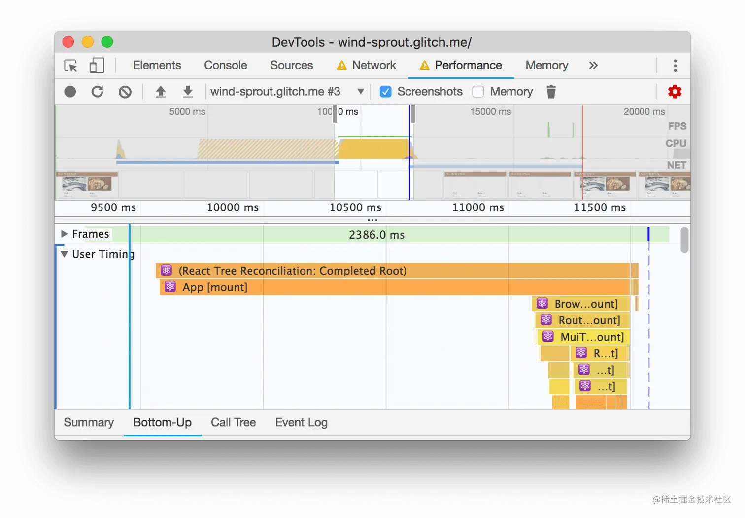 - 点击User Timing部分来展开它。根据似乎有一堆来自React的User Timing措施的事实,似乎Tony的应用程序正在使用React的开发模式。切换到React的生产模式,可能会轻松获得一些性能上的胜利。