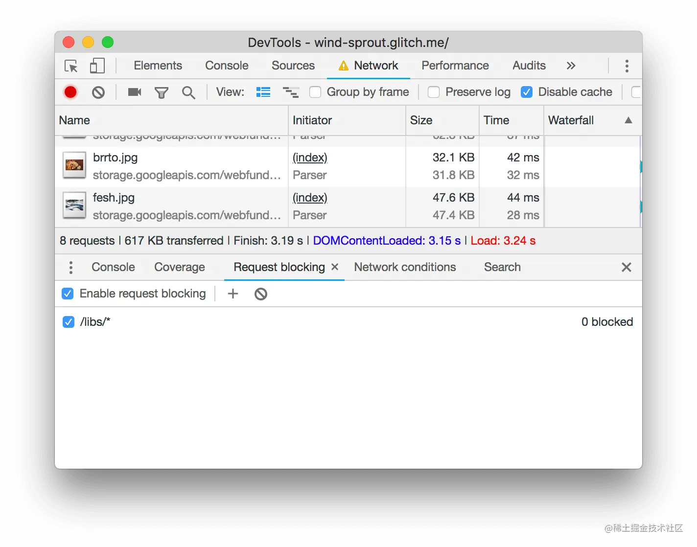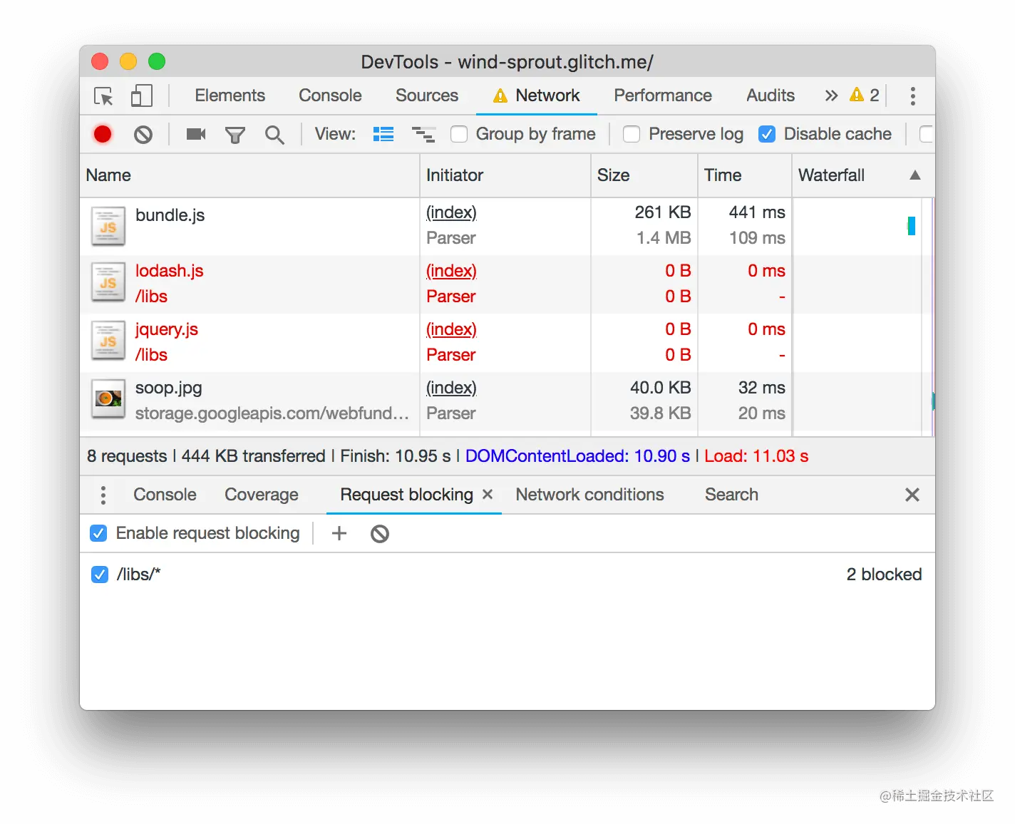 - 重新加载页面。jQuery和Lodash的请求是红色的,意味着它们被阻止了。页面仍然在加载,并且是交互式的,所以看起来根本不需要这些资源。