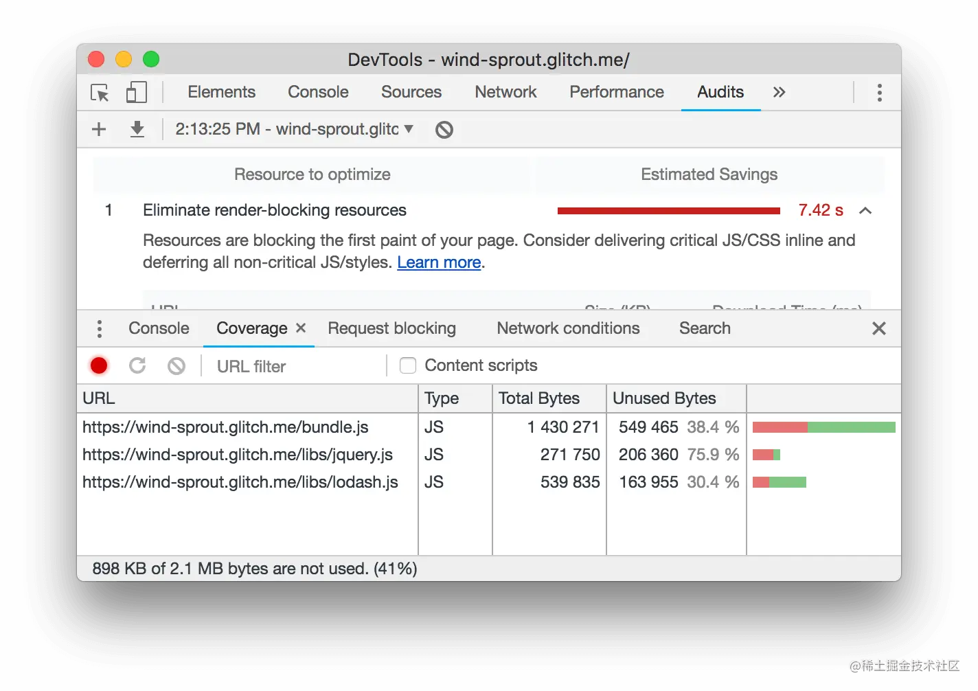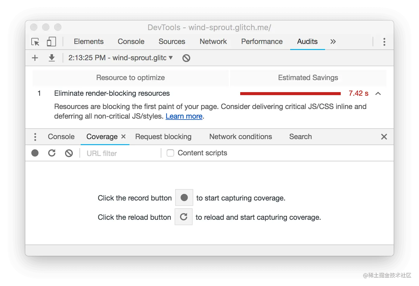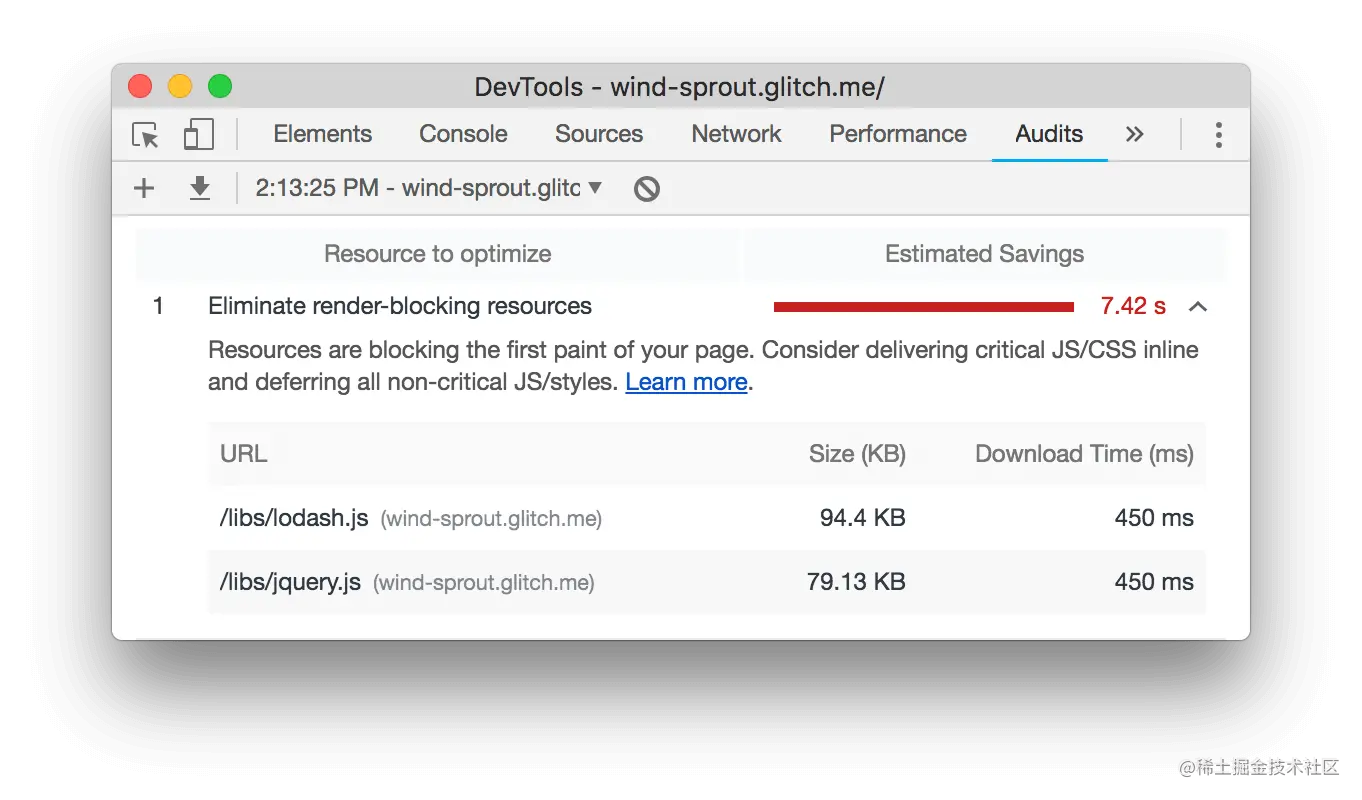 - 点击 "消除渲染阻塞资源 "来查看阻塞的资源: