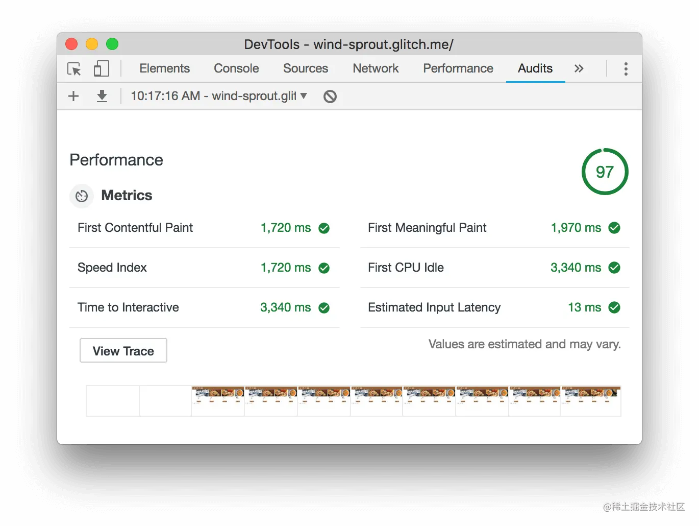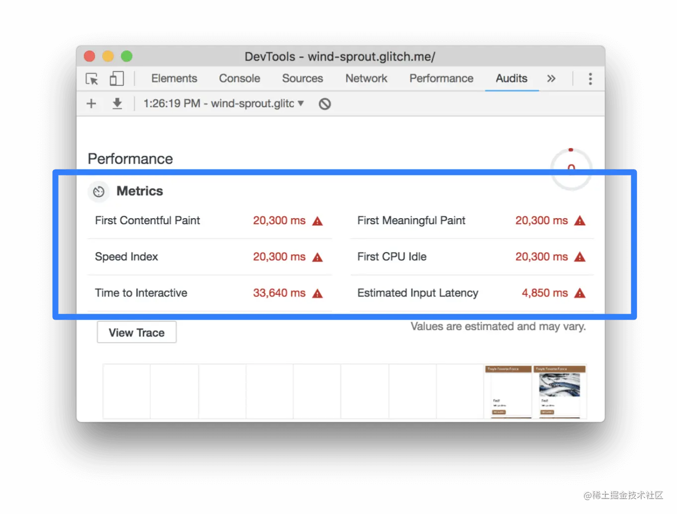 指标部分提供了网站性能的量化测量。每个指标都能深入了解性能的不同方面。例如,First Contentful Paint(首次内容绘制)告诉您内容何时首次绘制到屏幕上,这是用户感知页面加载的一个重要里程碑,而Time To Interactive(交互时间)则标志着页面出现在足以处理用户交互的时间点。
