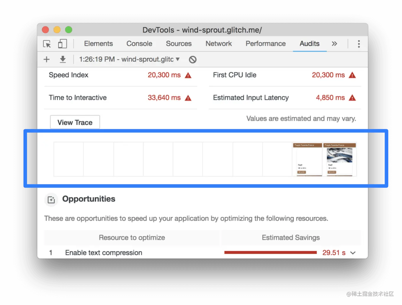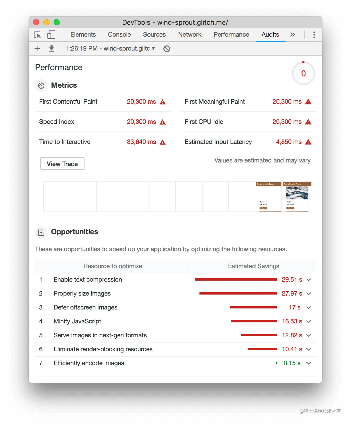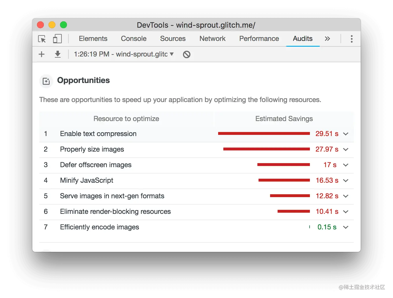 审核报告中的 "机会 "部分为您提供了关于如何提高页面性能的提示。在这一节中,您将实施对代码库的建议更改,在每次更改后对网站进行审计,以衡量其对网站速度的影响。