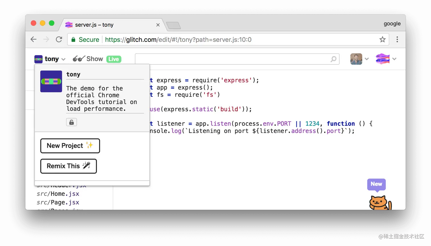 点击Remix This。项目名称从tony变成了某个随机生成的名称。现在你有了自己的可编辑的代码副本。稍后,你将对这段代码进行修改。