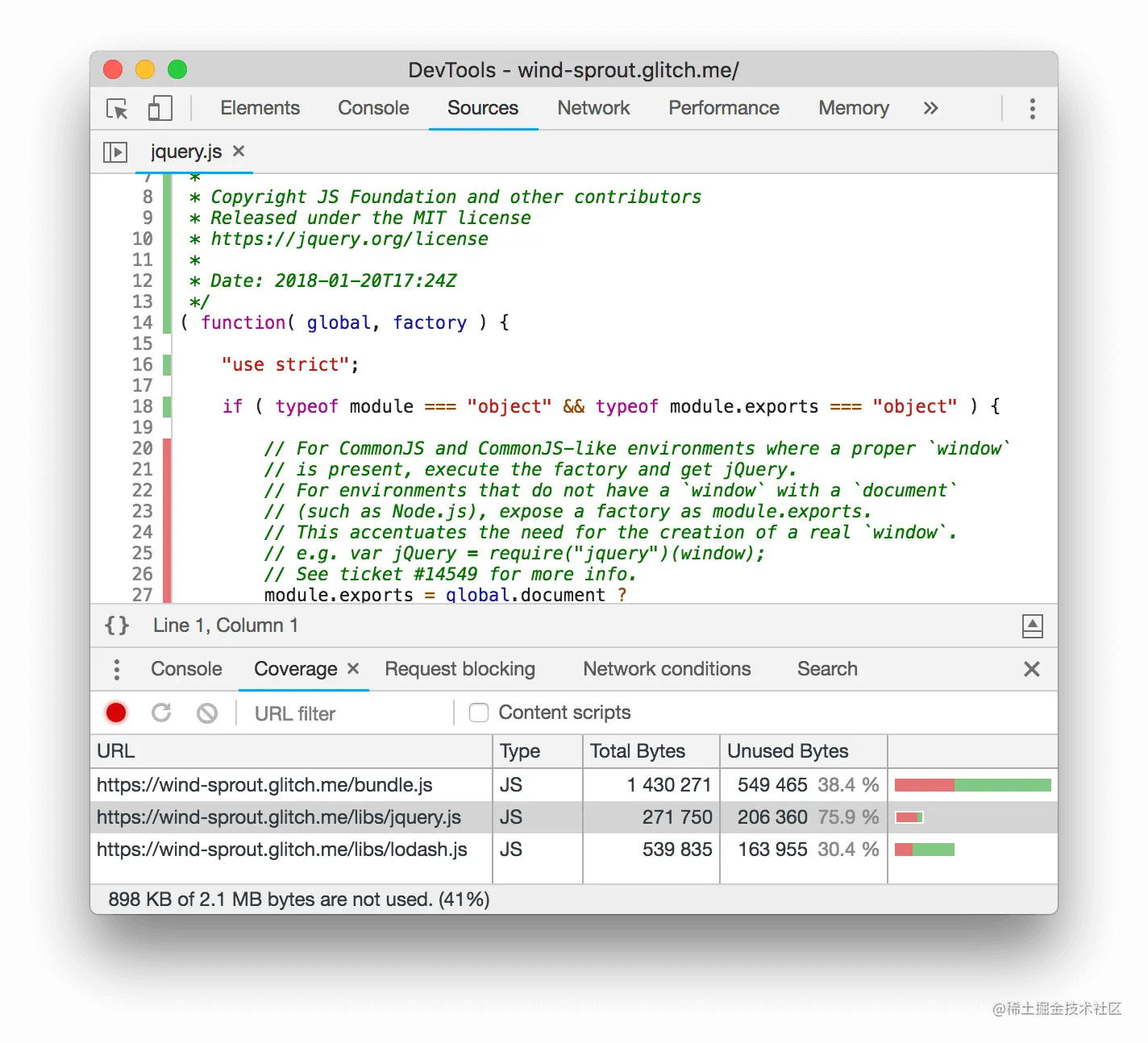 - 点击jquery.js行。DevTools会在Sources面板中打开该文件。如果一行代码旁边有绿色的条状物,则表示该行代码被执行。红色的条形表示它没有被执行,并且在页面加载时绝对不需要。