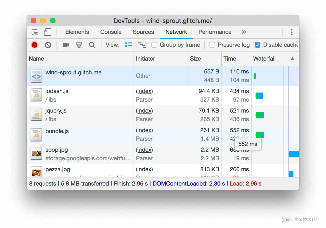 - 回到demo选项卡,重新加载页面。现在,"大小 "一栏应该为bundle.js等文本资源显示2个不同的值。在图24中,