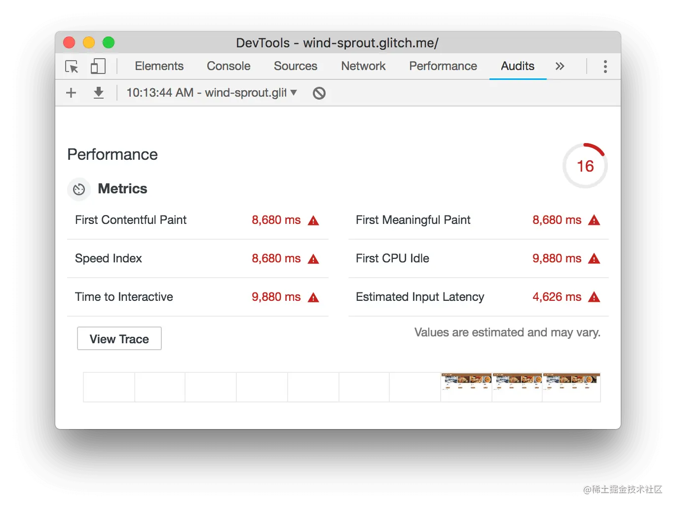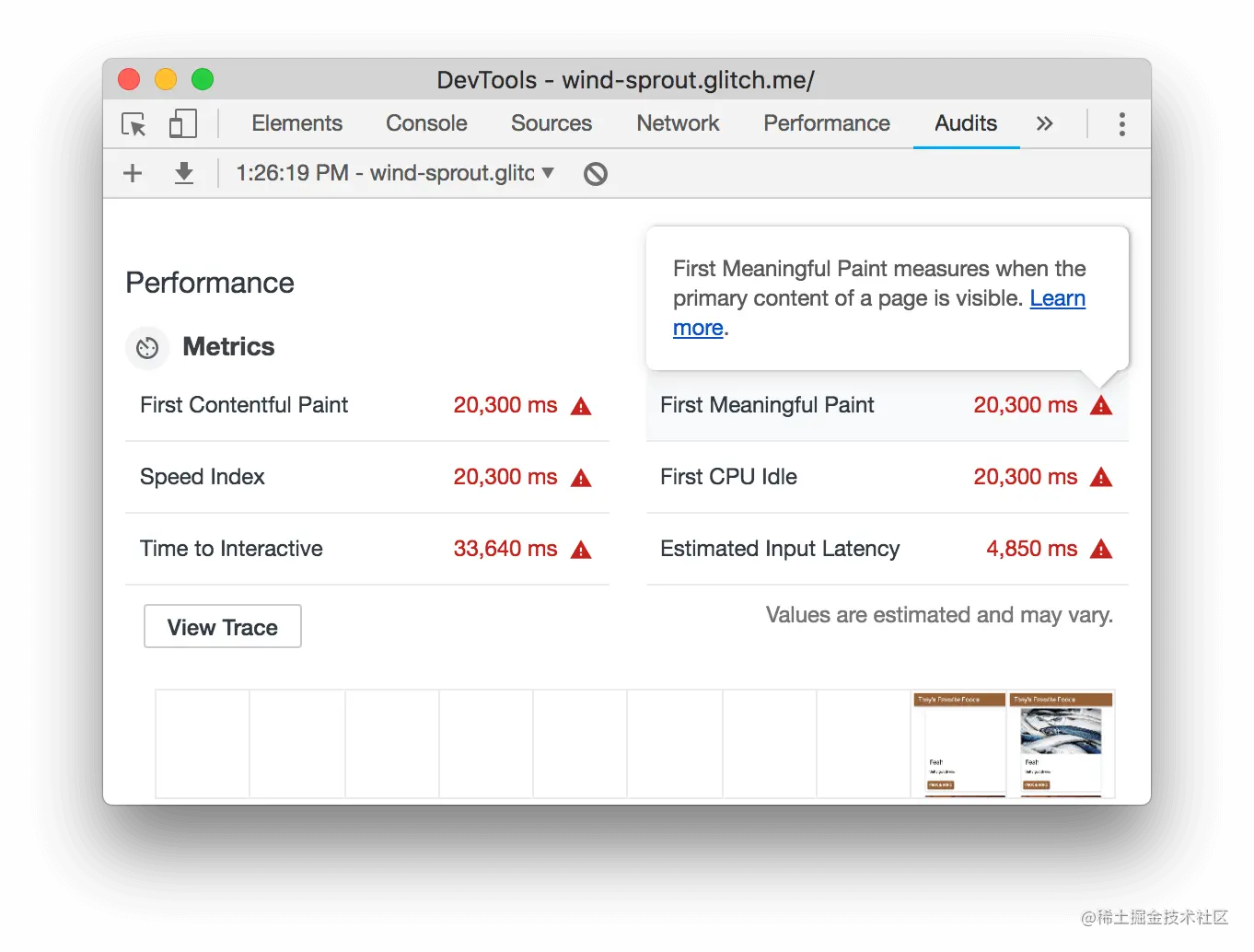 下面的指标是一组截图,显示页面在加载时的样子。