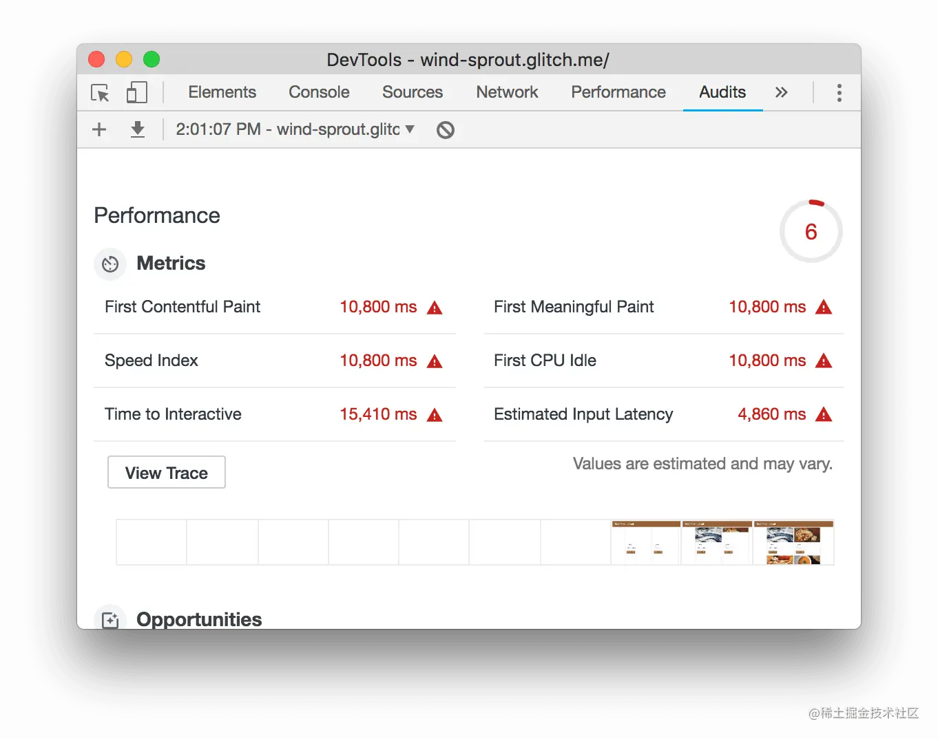 你的报告顶部的数字是网站的整体性能得分。之后,当你对代码进行修改时,你应该会看到这个数字上升。分数越高,意味着性能越好。