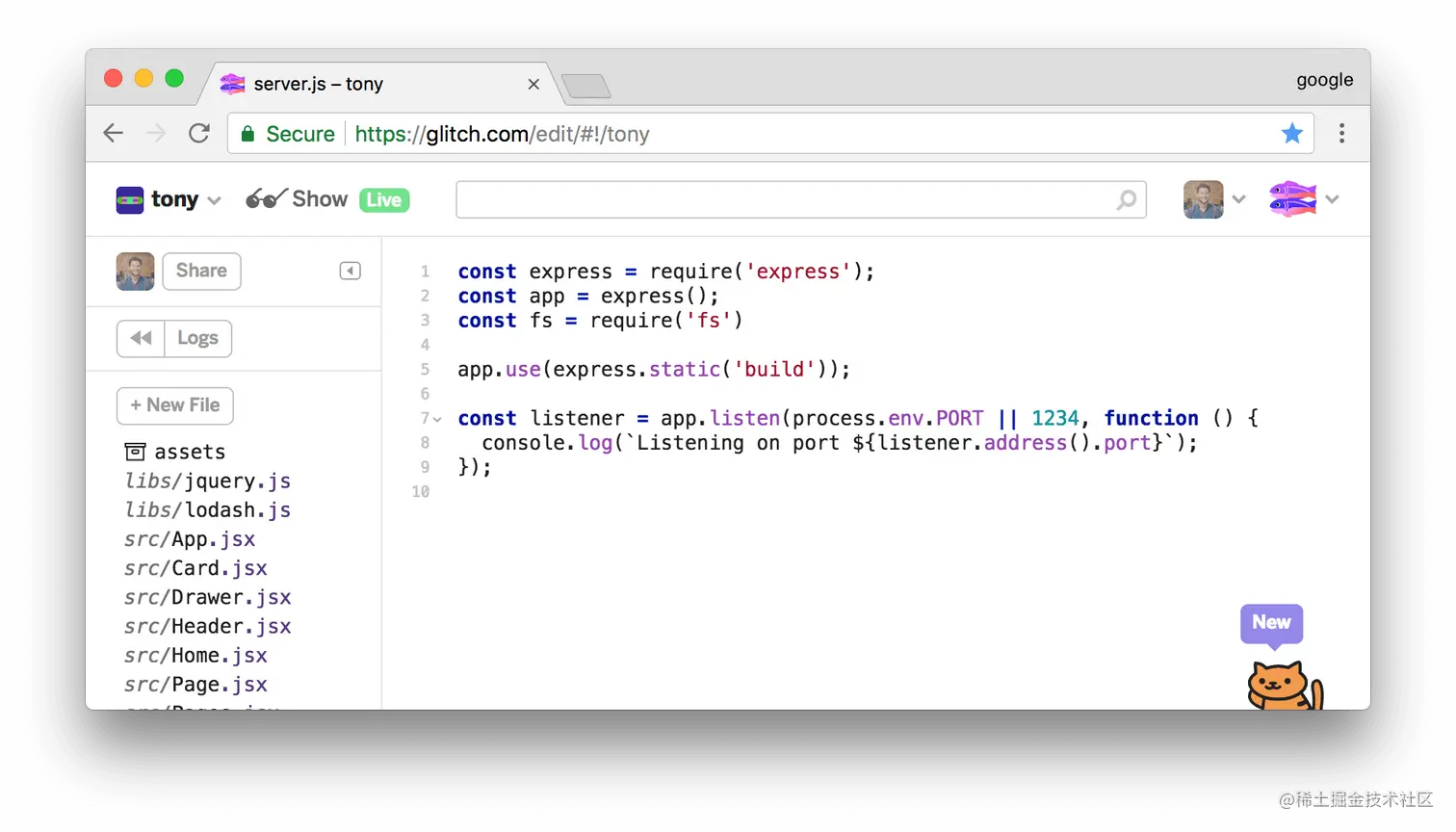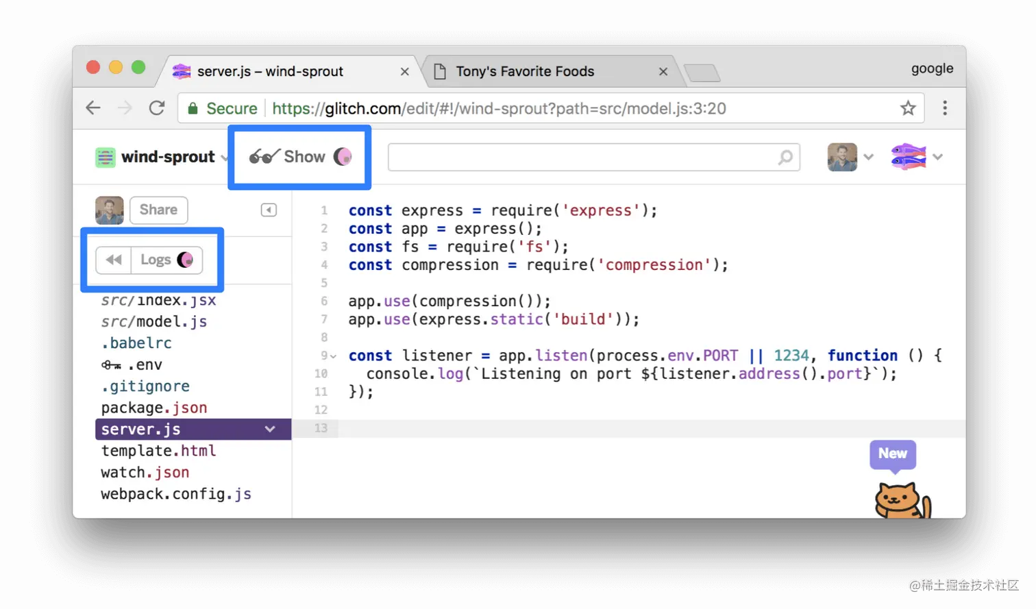 - 在编辑器选项卡中,点击server.js。